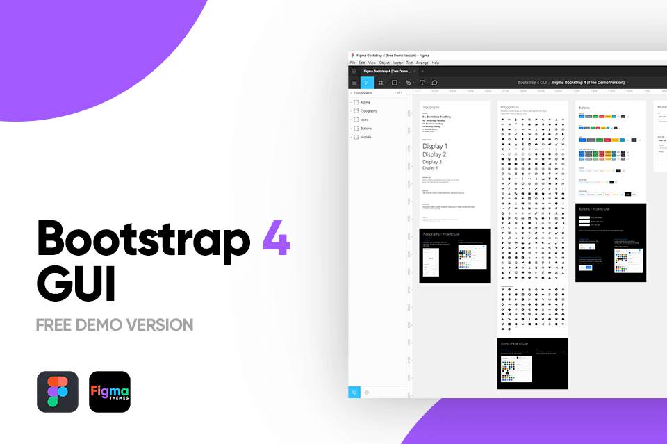 This is a free demo version of the Figma Bootstrap 4 GUI Component Library. It includes buttons, icons, typography and modals, as well as the color and text styles.