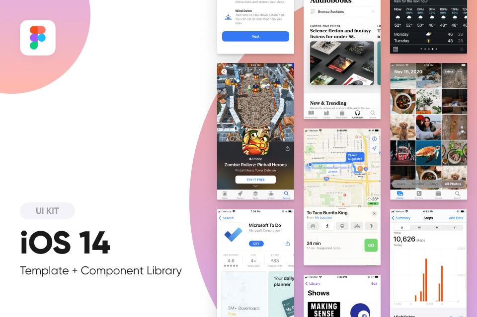 Kickstart your next iOS project faster than ever. Based on Apple's Human Interface Guidelines, this comprehensive library perfectly matches iOS specifications. Using a template-first approach, Figma iOS 14 has been built from the ground up to help you design beautiful iOS screens with ease.